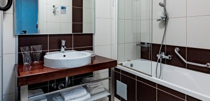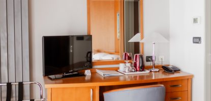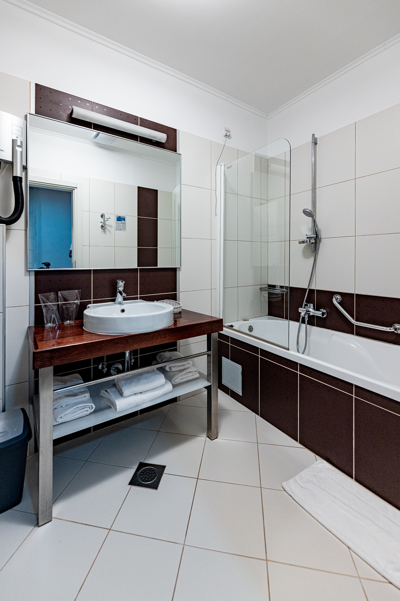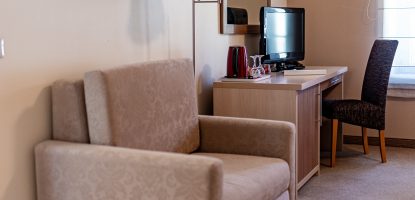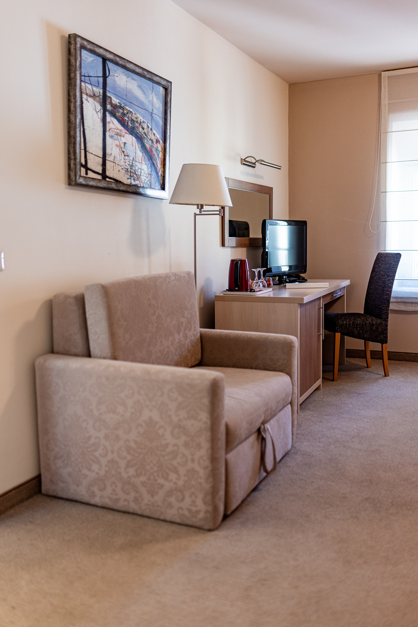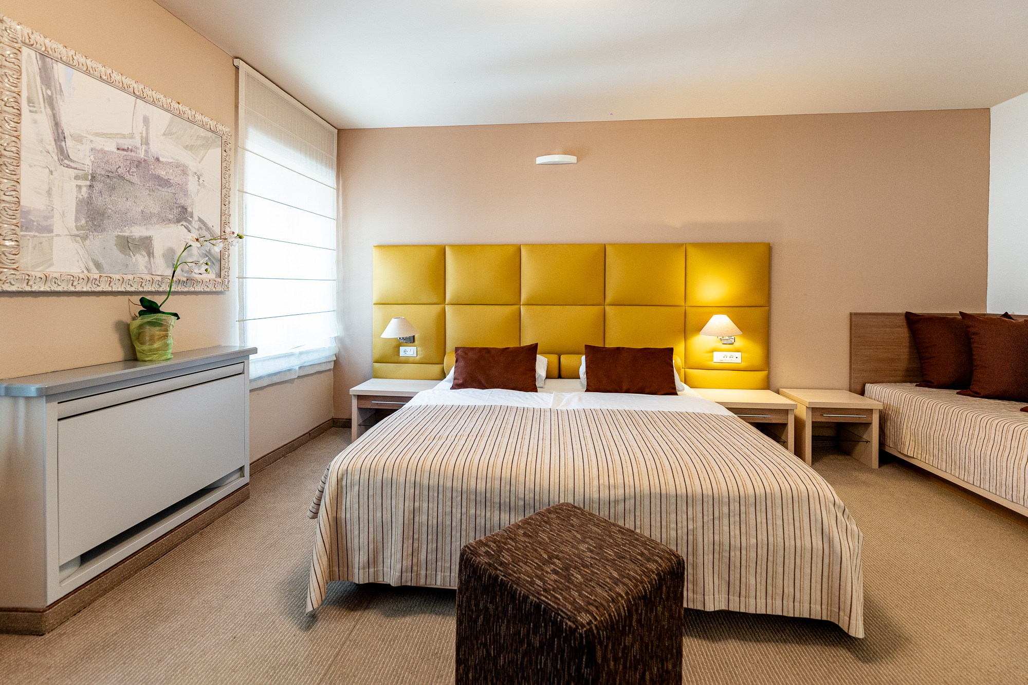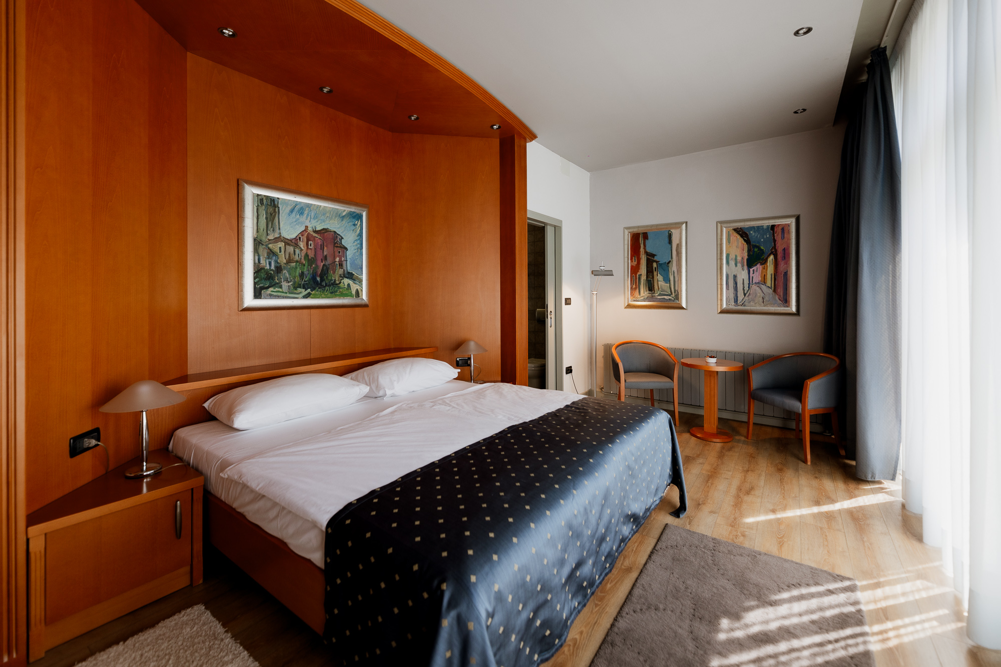 The Modern room gives off harmony with its modern design and comfort. It dominates with warm, relaxing tones, which invite rest and relaxation. This double room has an additional bed for accommodating a third person. The windows and terrace offer a view of the main city square in front of the hotel. The Modern room is an ideal place for all who wish to enjoy modern and spatial accommodation in a centuries-old palace.