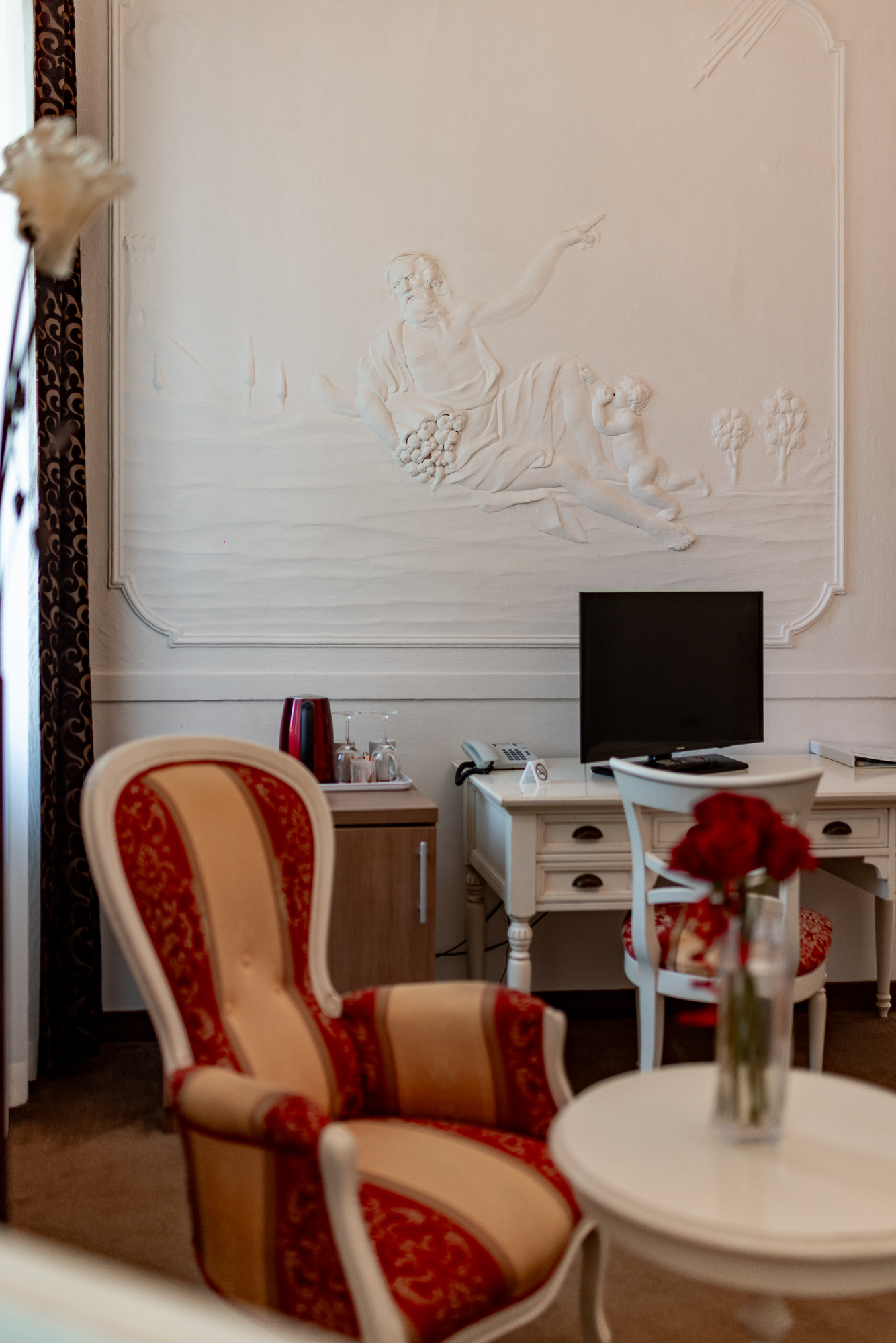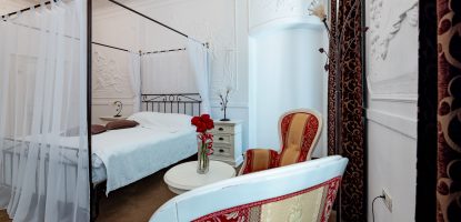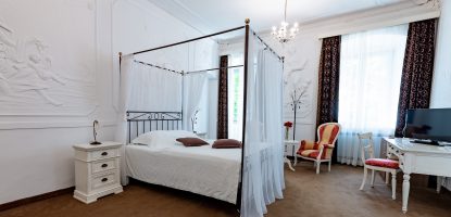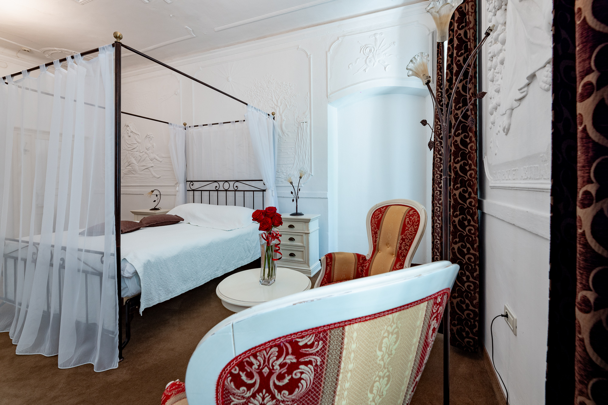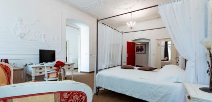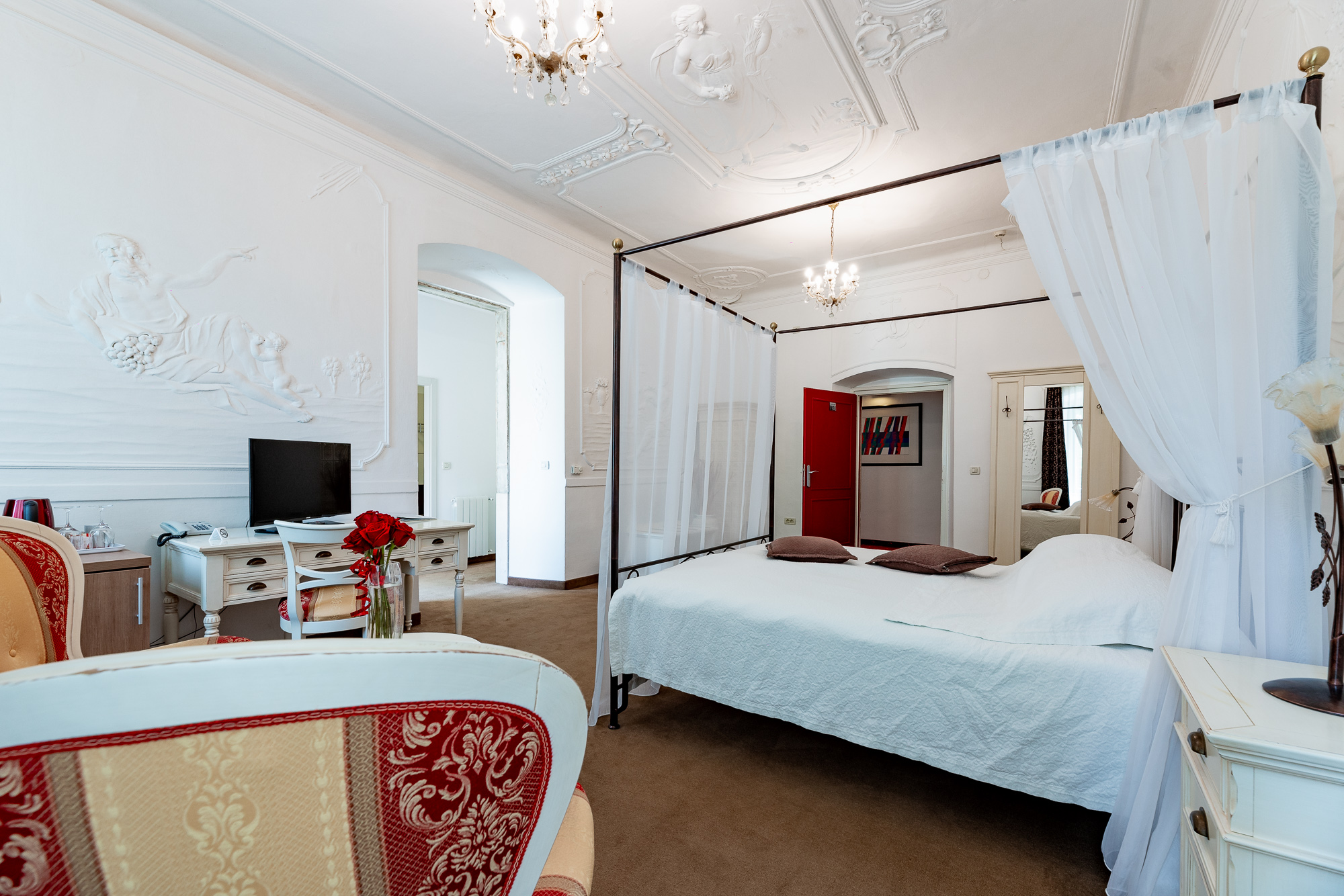 The Castellum room is the most original accommodation unit of our hotel. It is a room with authentic stuccowork from the 17th century. The decorative relief elements show the four seasons of the year and testify of the primary construction of the Polessini Palace. The room is furnished in baroque style and has a bed with a canopy and a terrace with a view of the city square. The elegant and romantic Castellum room ensures an unforgettable ambient where the past and present connect.